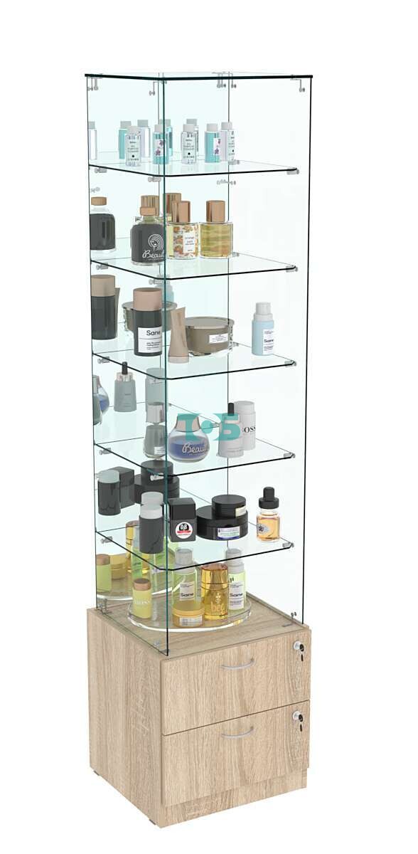 • Накопитель с выдвижными ящиками: в конструкции витрины предусмотрены два выдвижных ящика с врезными замками. Это позволяет хранить дополнительные товары или аксессуары, обеспечивая их безопасность.