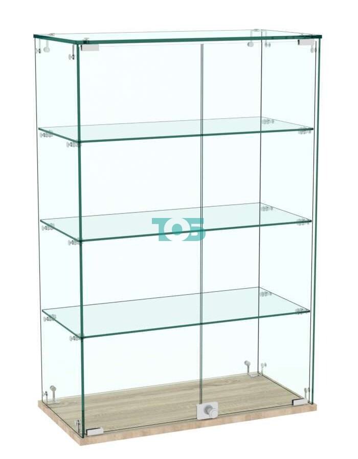 Стеклянная торговая витрина широкая с пятнадцатью двойными полочками из прозрачного стекла Фрактал №3-2