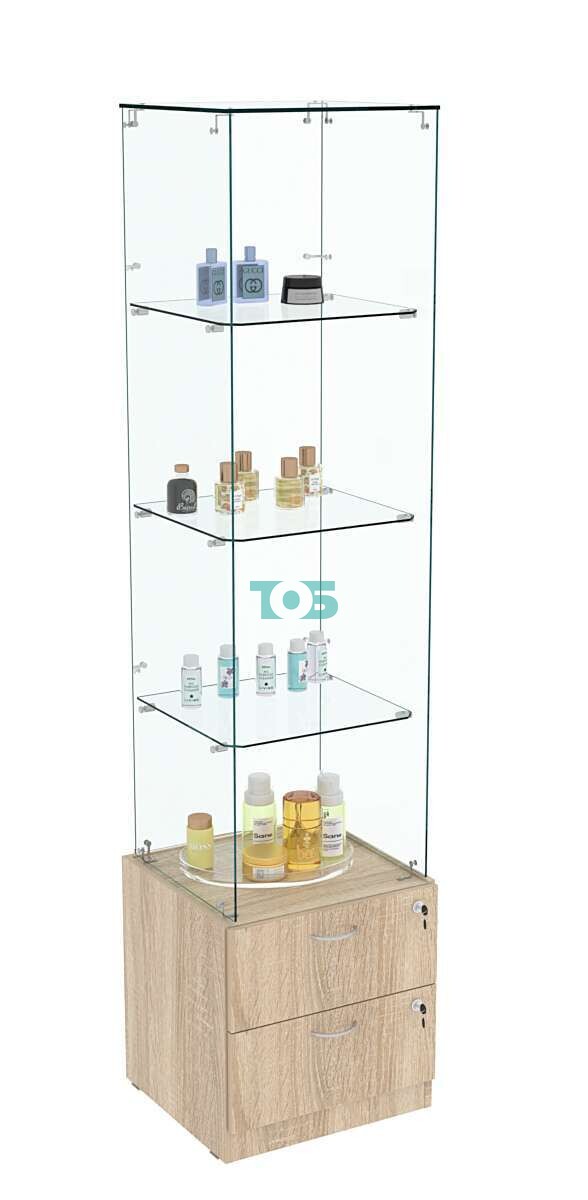 Накопитель с выдвижными ящиками: в конструкции витрины предусмотрены два выдвижных ящика с врезными замками. Это позволяет хранить дополнительные товары или аксессуары, обеспечивая их безопасность.