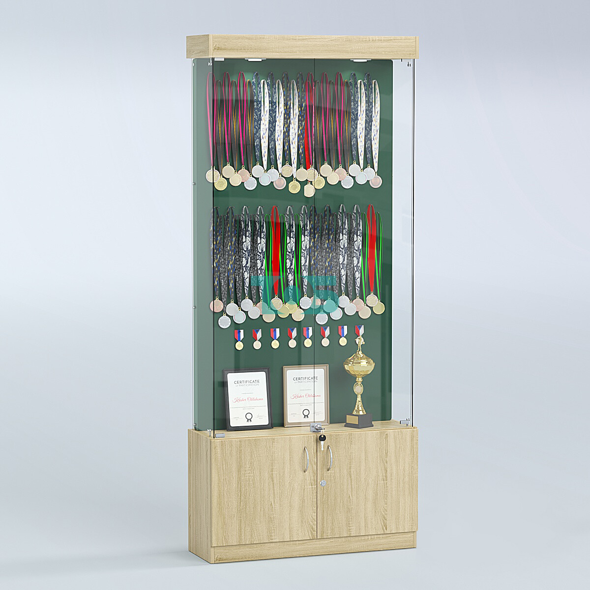 Подсветка: витрина оснащена встроенной верхней подсветкой, которая подчёркивает красоту представленных наград и создаёт эффектное освещение.