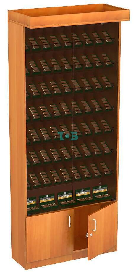 Витрина для сигарет и сигар №1 с тонированным стеклом на 63 отсека (закрытая, задняя стенка - ДВП представляет из себя прекрасный вариант витрины для экспозиции табачной продукции различных брендов клиенту в рамках закона о продаже табачных изделий 2015. С фасада витрина закрыта распашными дверьми из тонированного стекла, что обеспечивает 50%-ую светопропускаемость. Внутри витрины расположены 7 наклонных полок с разделителями и стеклянным торцом, который позволяет полностью показать марку упаковки сигарет/сигар. Нижняя полка расположена горизонтально и предназначена для выкладки деревянных коробок с сигарами либо курительных трубок.