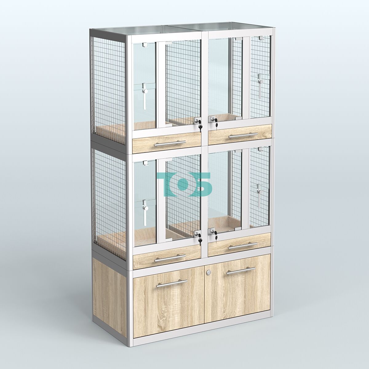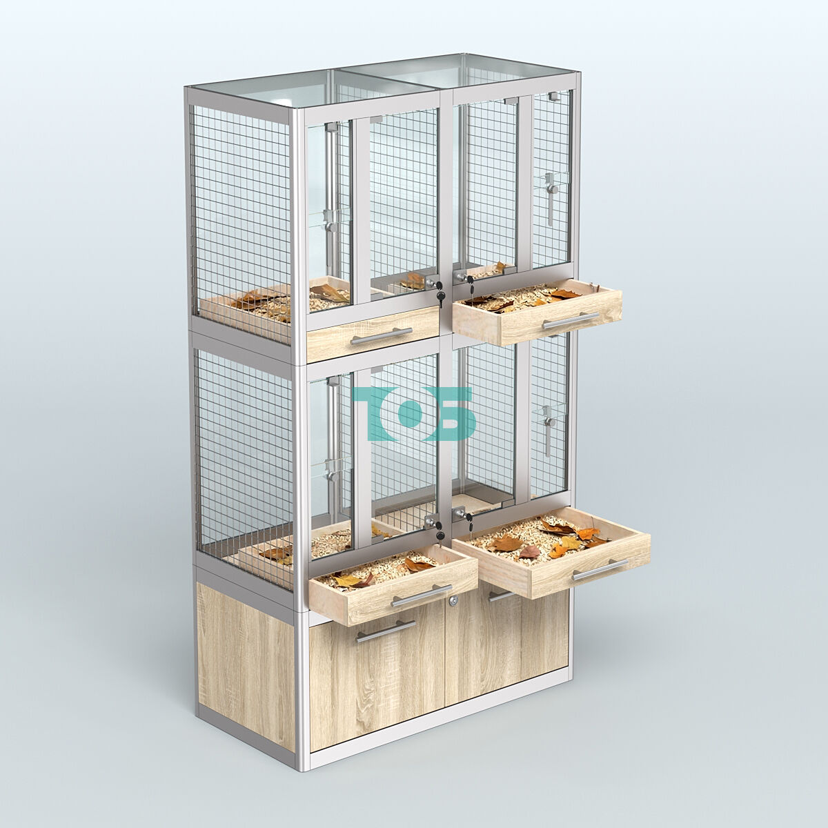 - специализированная витрина в Зоо магазин предназначена для продажи птиц таких как: амадины, чижи, канарейки, щеглы, зяблики и попугаи. Каждый из двух горизонтальных отсеков витрины укомплектован внутренними разделителями из сетки, внешней стеклянной дверкой с замком, вертикальными раздвижными шторками с замком (для возможности достать только одну птицу) и выдвижными ящиками для сбора опилок и помета;