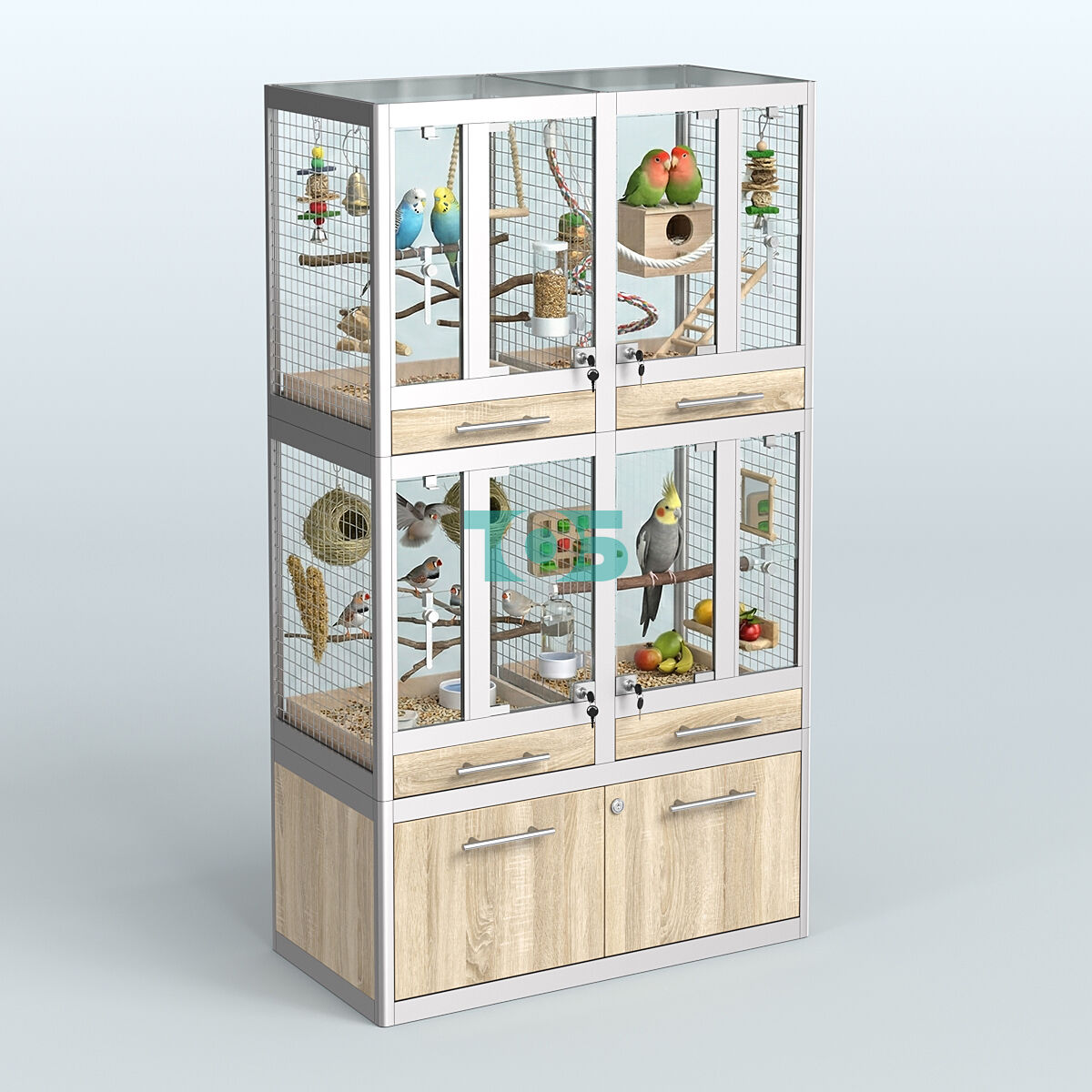 - каждый отсек для птиц укомплектован: внутренним разделителем из сетки, внешней стеклянной дверкой с замком, вертикальными раздвижными стеклянными шторками с замком (для возможности достать только одну птицу) и выдвижным ящиком для сбора опилок и помета;