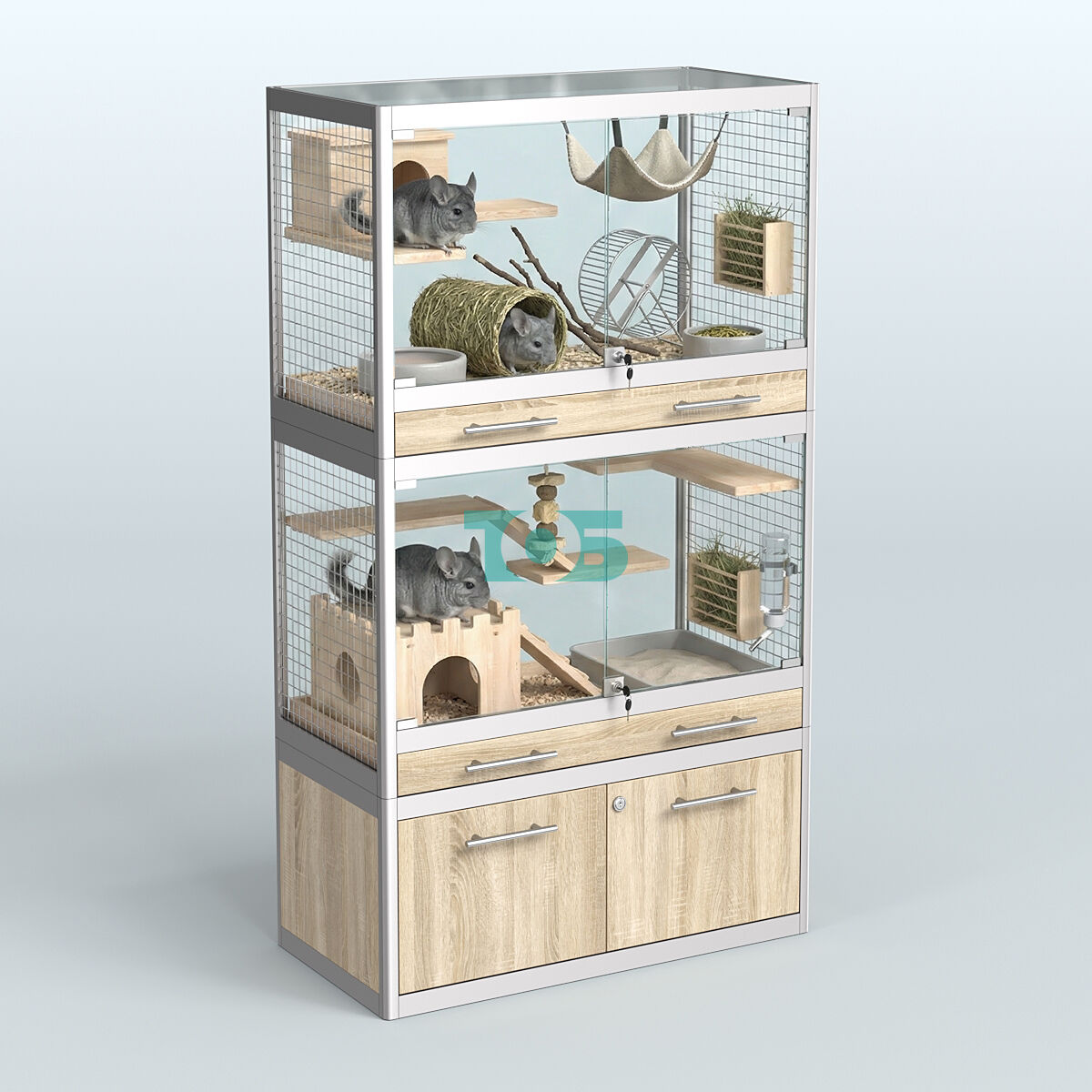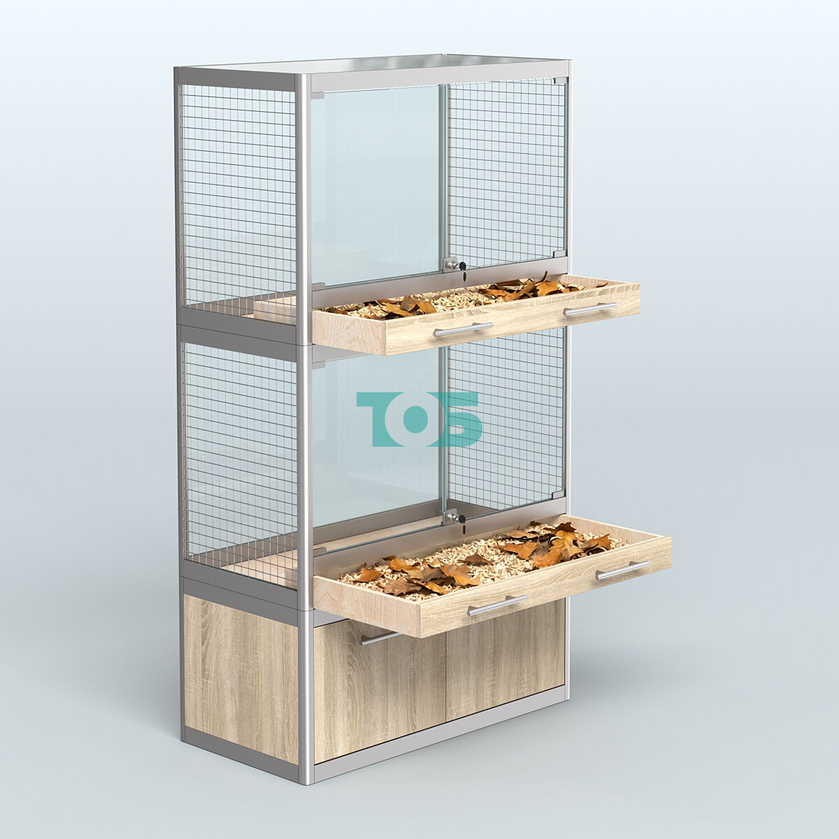 - каждый отсек для животного укомплектован: торцами из сетки, внешними стеклянными дверками с замком и одним выдвижным ящиком из фанеры для сбора опилок и помета;