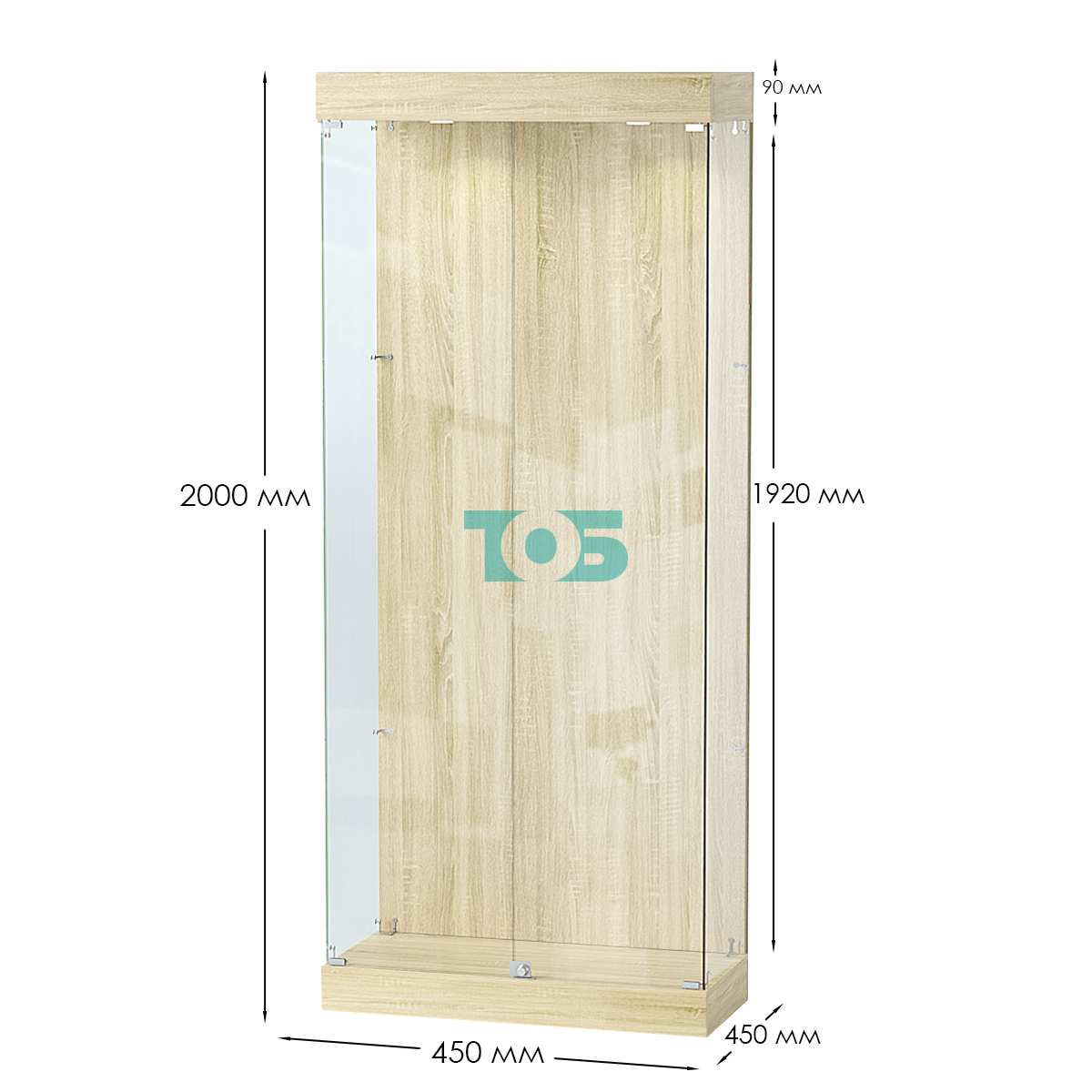 Размеры: высота чистового внутреннего проёма витрины составляет 1920 мм, высота нижнего подиума — 90 мм, а высота верхнего фриза с подсветкой — 90 мм.