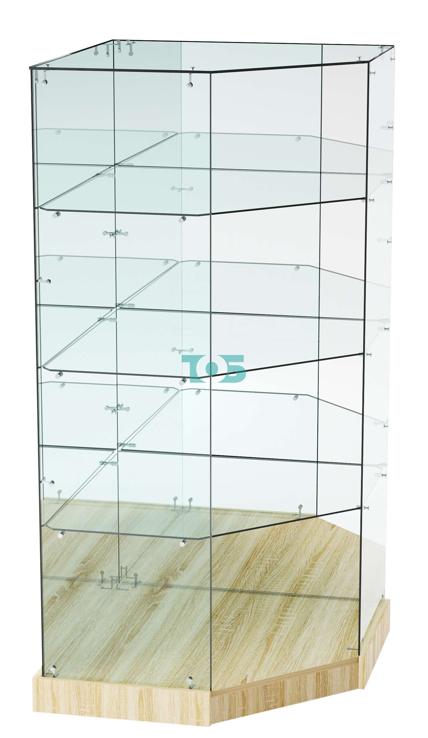 Экономия пространства: пятигранная угловая форма витрины позволяет эффективно использовать углы помещений, не занимая много места, что особенно ценно в условиях ограниченного пространства.