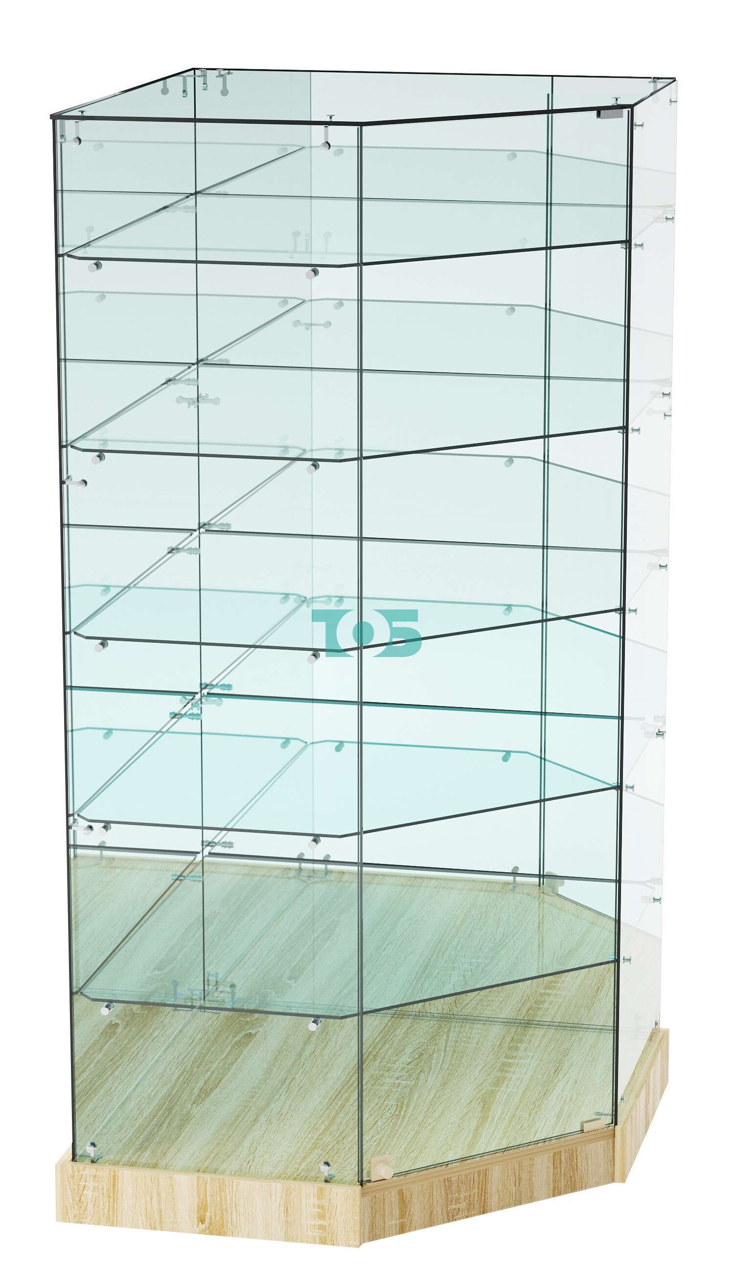 Экономия пространства: пятигранная угловая форма витрины позволяет эффективно использовать углы помещений, не занимая много места.