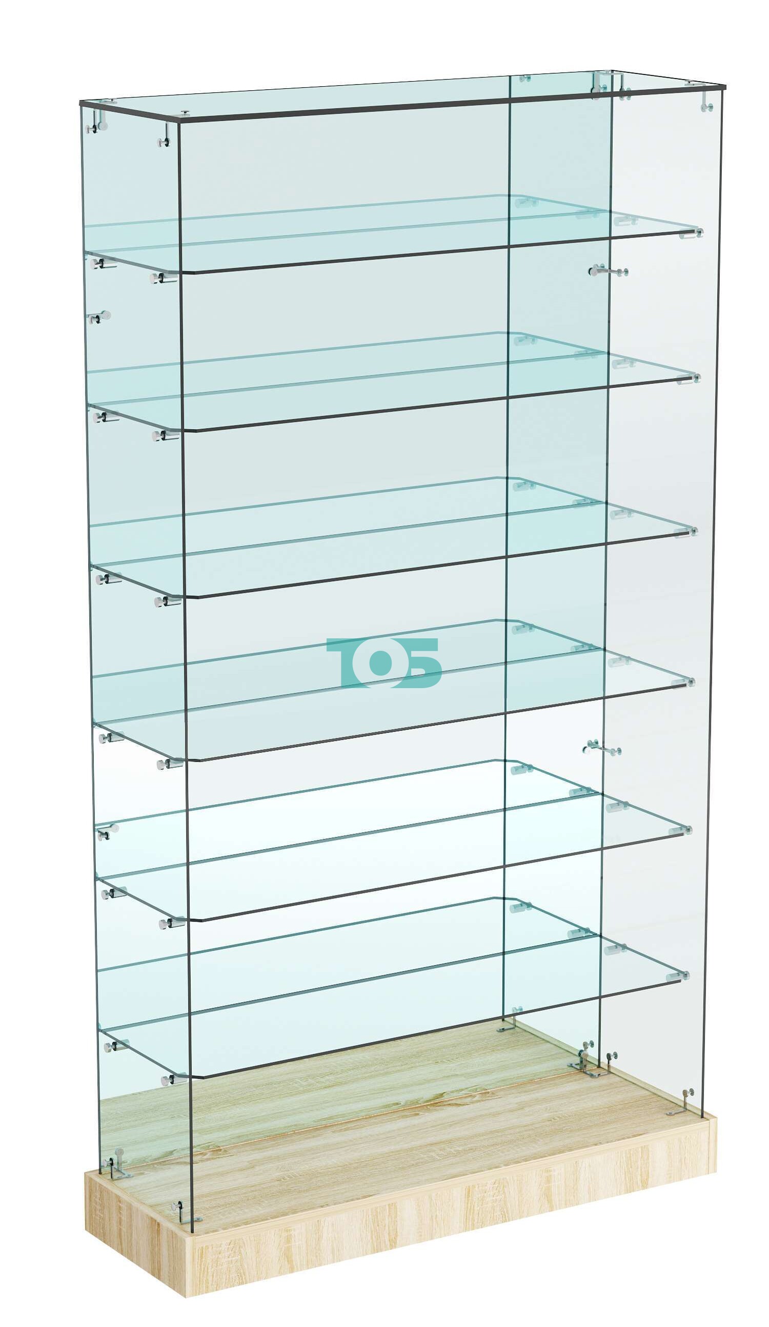 Шесть стеклянных полок и одна полка из ДСП: предоставляют разнообразные варианты для размещения различных видов продукции, что позволяет организовать пространство максимально эффективно.