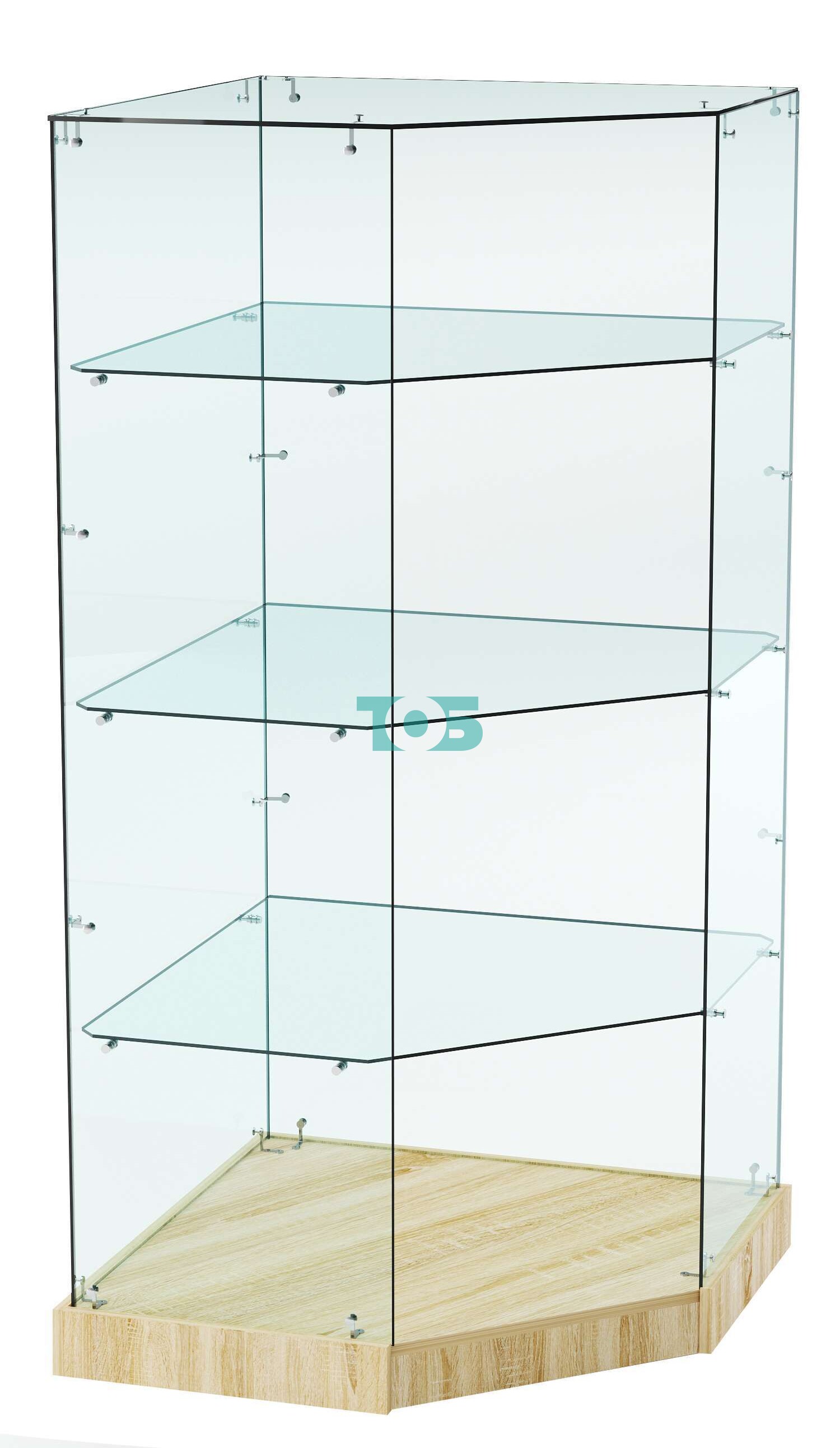 Экономия пространства: пятигранная угловая форма витрины позволяет эффективно использовать углы помещений, не занимая много места, что особенно важно для магазинов с ограниченной площадью.