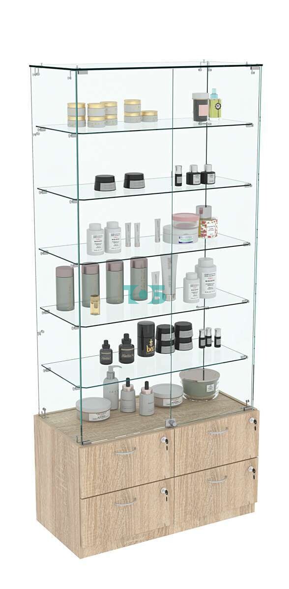 Накопитель с выдвижными ящиками: в конструкции витрины предусмотрены четыре выдвижных ящика с врезными замками. Это позволяет хранить дополнительные товары или аксессуары, обеспечивая их безопасность.