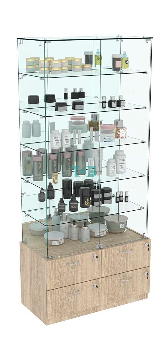 Накопитель с выдвижными ящиками: в конструкции витрины предусмотрены четыре выдвижных ящика с врезными замками. Это позволяет хранить дополнительные товары или аксессуары, обеспечивая их безопасность и порядок.