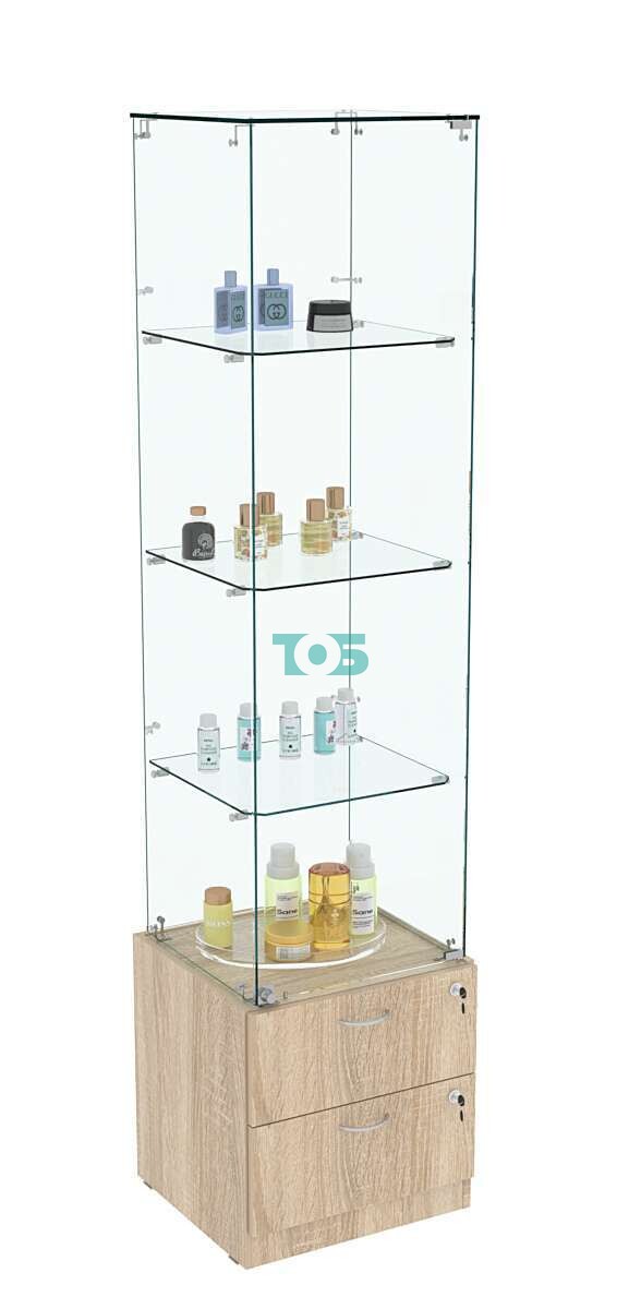 Накопитель с выдвижными ящиками: в конструкции витрины предусмотрены два выдвижных ящика с врезными замками. Это позволяет хранить дополнительные товары или аксессуары, обеспечивая их безопасность.