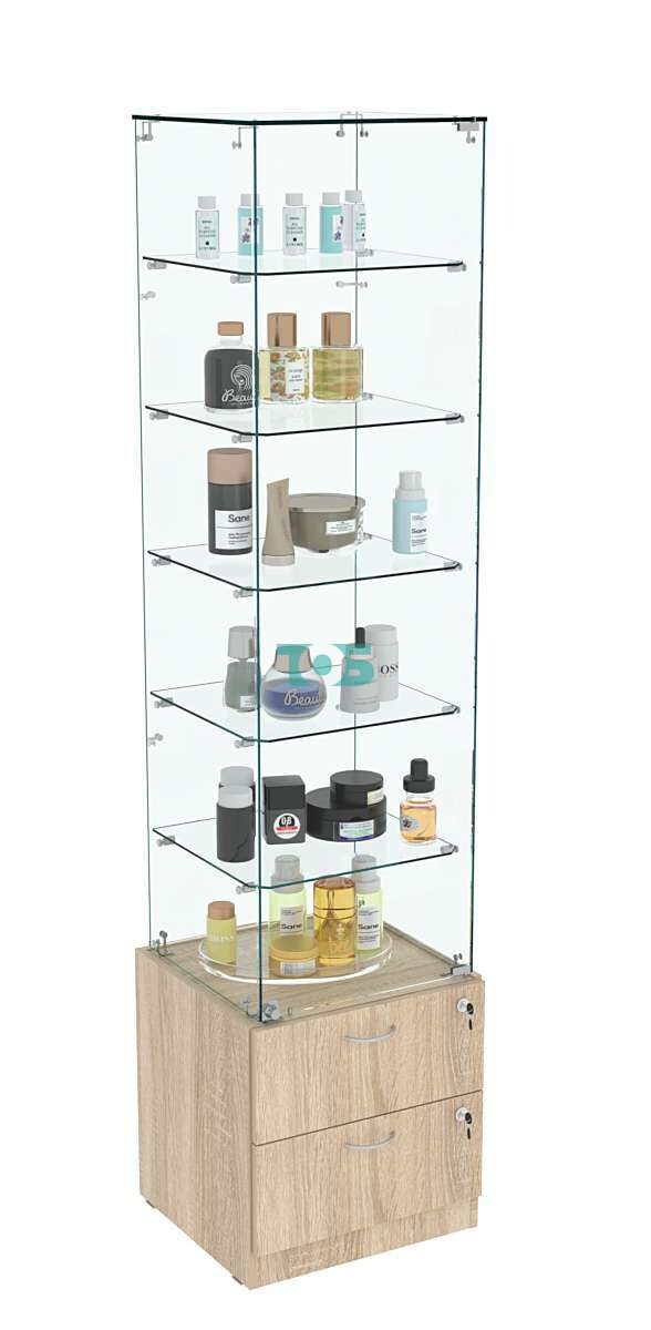Накопитель с выдвижными ящиками: в конструкции витрины предусмотрены два выдвижных ящика с врезными замками. Это позволяет хранить дополнительные товары или аксессуары, обеспечивая их безопасность.