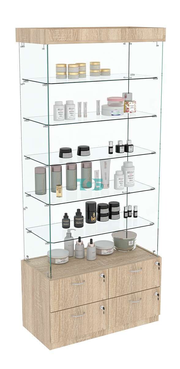 Накопитель с выдвижными ящиками: в конструкции витрины предусмотрены четыре выдвижных ящика с врезными замками. Это позволяет хранить дополнительные товары или аксессуары, обеспечивая их безопасность.