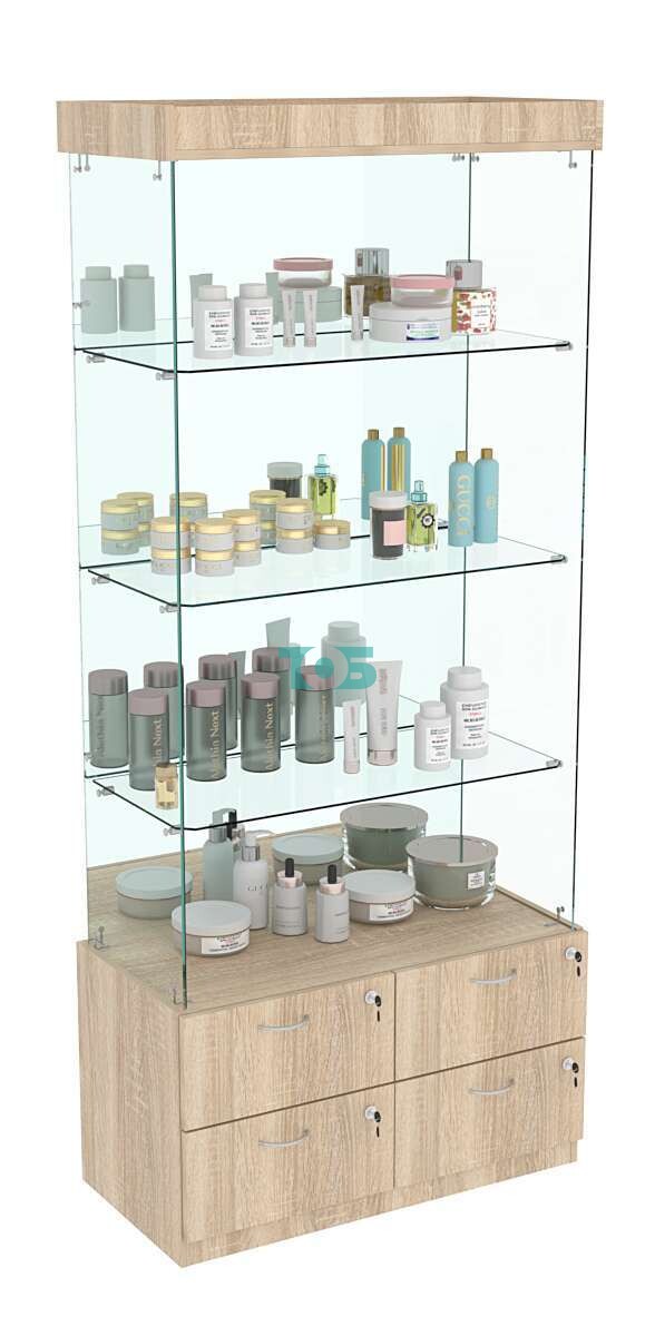 Накопитель с выдвижными ящиками: в конструкции витрины предусмотрены четыре выдвижных ящика с врезными замками. Это позволяет хранить дополнительные товары или аксессуары, обеспечивая их безопасность.