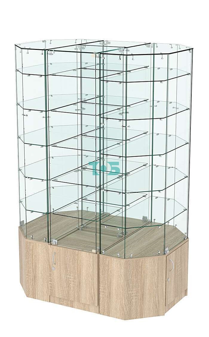 • Нижняя часть с распашной дверью: В нижней части витрины предусмотрена распашная дверь с замком, что предоставляет дополнительное пространство для хранения.