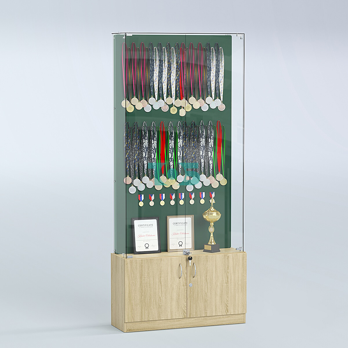 • Конструкция: верх витрины прозрачный, что позволяет удобно размещать и просматривать награды. В прозрачной части установлены распашные стеклянные двери с замком, обеспечивающие безопасность содержимого. В накопителе также распашные дверки из ДСП с замком.