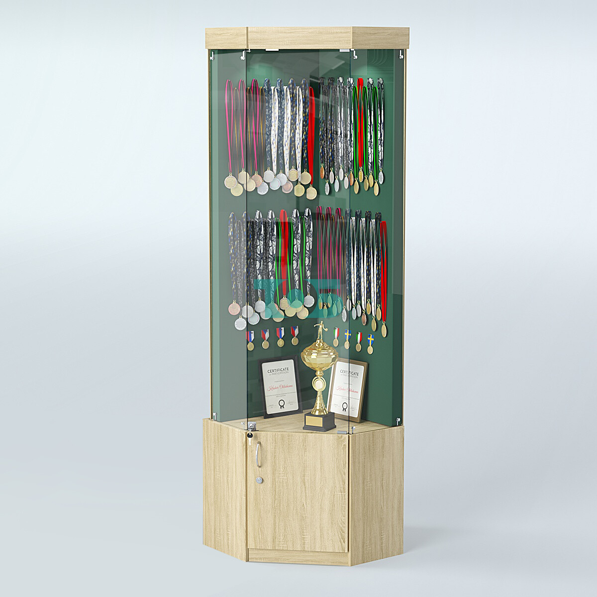 • Конструкция: центральная часть витрины прозрачная, что позволяет удобно размещать и просматривать награды. В прозрачной части установлена распашная стеклянная дверь с замком, обеспечивающая безопасность содержимого. В нижней части — распашная дверь из ДСП с замком.