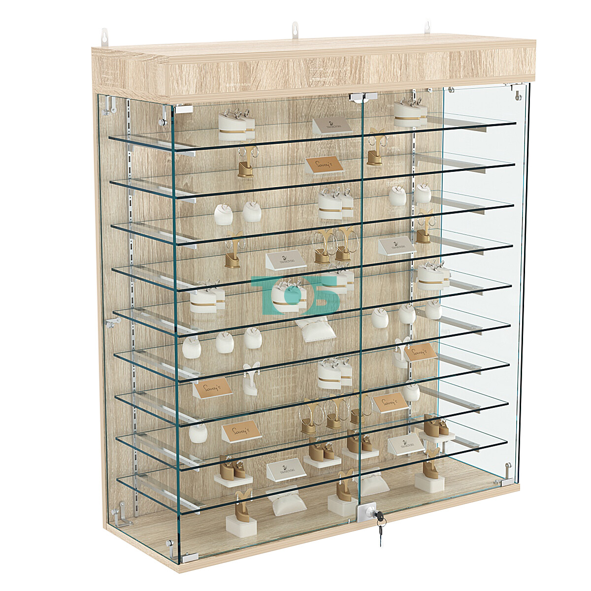 • Девять полок: Витрина оснащена девятью стеклянными полками, которые можно легко регулировать по высоте, что позволяет гибко настраивать внутреннее пространство под различные размеры и типы товаров.