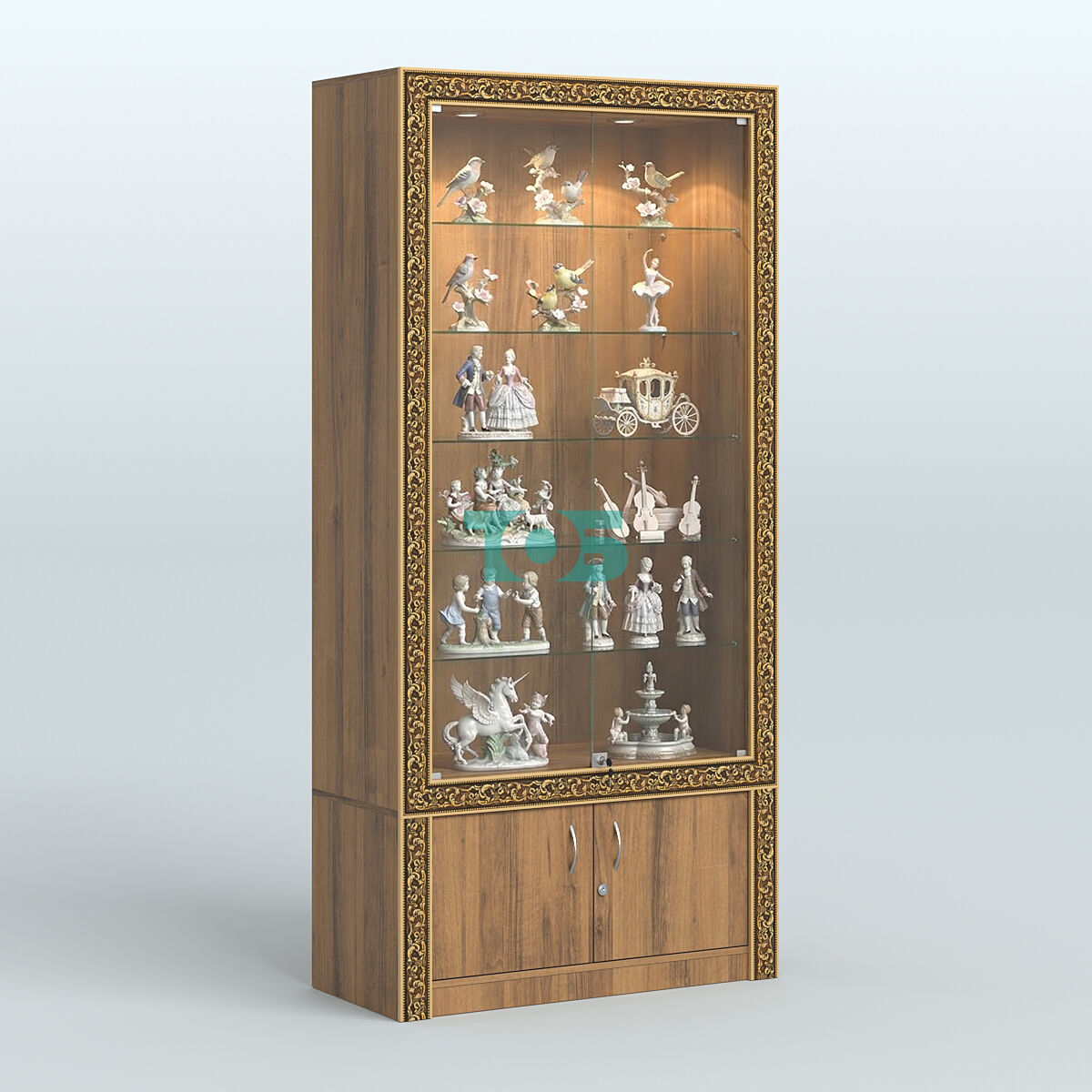 - серия витрин у которых фасадная часть декорированная цветными молдингами под золото. Эти элементы подчеркивают четкость линий, что помогает вписать витрину в интерьер любого стиля;