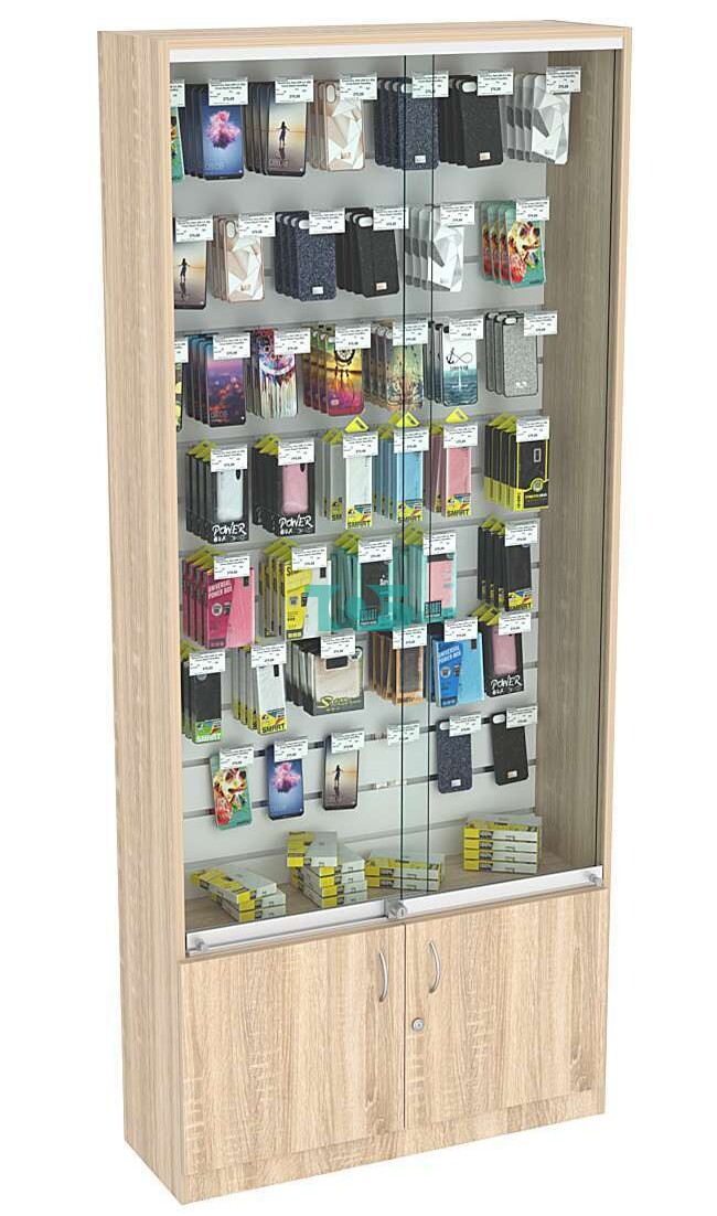 Нижнее отделение: в нижней части витрины расположена распашная дверь с замком, что позволяет организовать хранение товаров и обеспечить их безопасность.