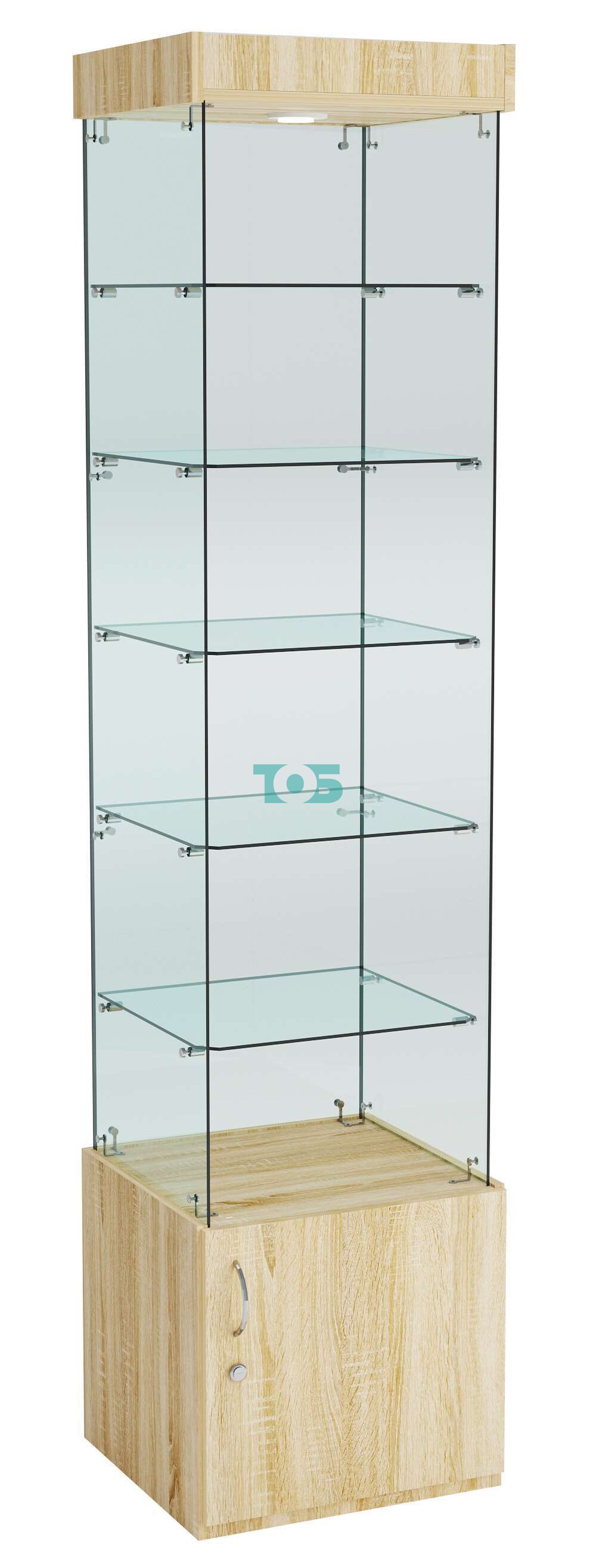 - Верхняя подсветка: Витрина оснащена верхней подсветкой, что создает эффектное освещение и улучшает видимость представленных товаров, подчеркивая их привлекательность.