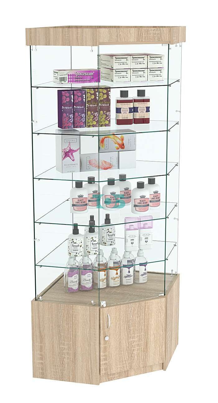 Угловая витрина № 913 — это стильная и функциональная модель с пятигранной формой, которая идеально подходит для демонстрации товаров в магазинах и выставочных пространствах.