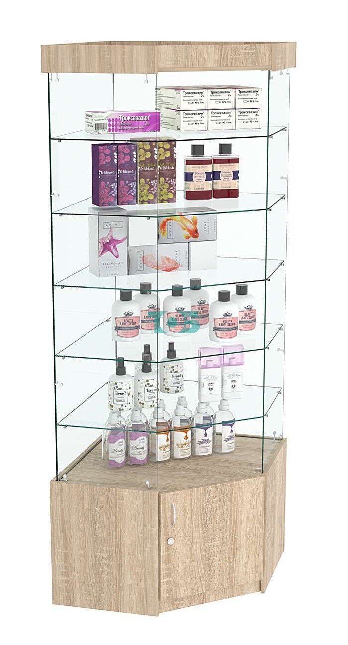Угловая витрина "Истра" № 9113 — это элегантная и современная модель с пятигранной формой, разработанная для стильной демонстрации товаров в магазинах и выставочных залах.