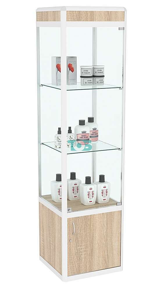 - Тумба-накопитель с дверьми на распашку с замком в витрине из профиля используется для хранения товаров.
