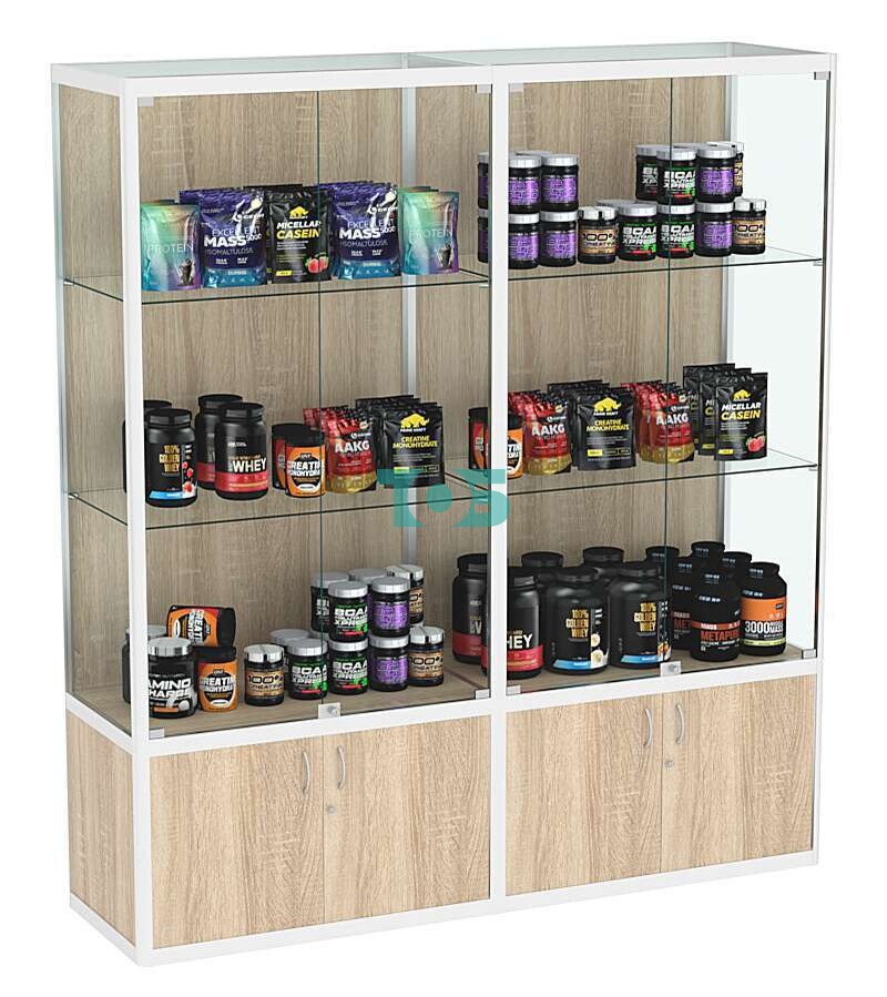 - Тумба-накопитель с распашными дверями в витрине из профиля используется для хранения товаров, а также документов или сопутствующих для работы предметов.