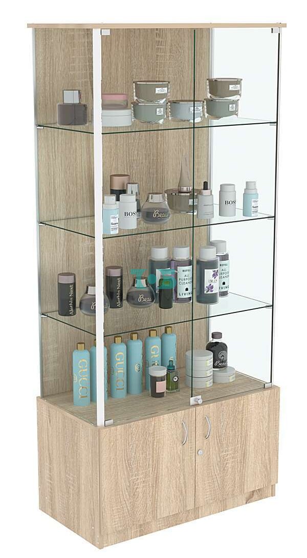 - В нижней части имеются распашные двери с замком. Такая конструкция придает надёжность и безопасность витрине, делает ее более внешне эстетичней, а также отличается удобсвтом в использовании.