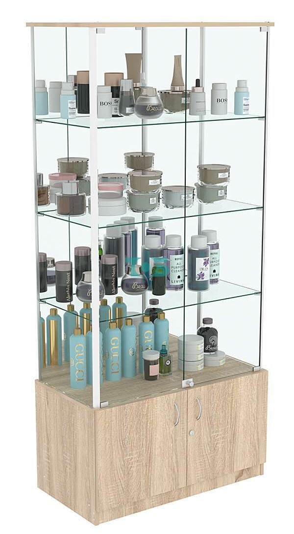 - Задняя стенка зеркальная. Такая деталь визуально увеличивает пространство, делая выставленные предметы на полках более заметными и привлекательными. Помимо этого, улучшает обзор, т.к покупатели могут видеть товары со всех сторон.