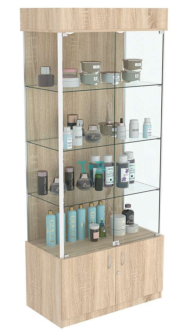 - В нижней части имеются распашные двери с замком. Такая конструкция придает надёжность и безопасность витрине, делает ее более внешне эстетичной, а также отличается удобством в использовании.