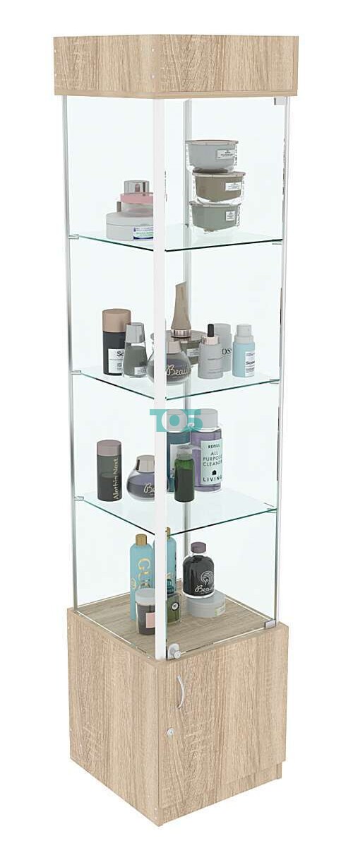 - В нижней части имеются распашные двери с замком. Такая конструкция придает надёжность и безопасность витрине, делает ее более внешне эстетичной, а также отличается удобством в использовании.