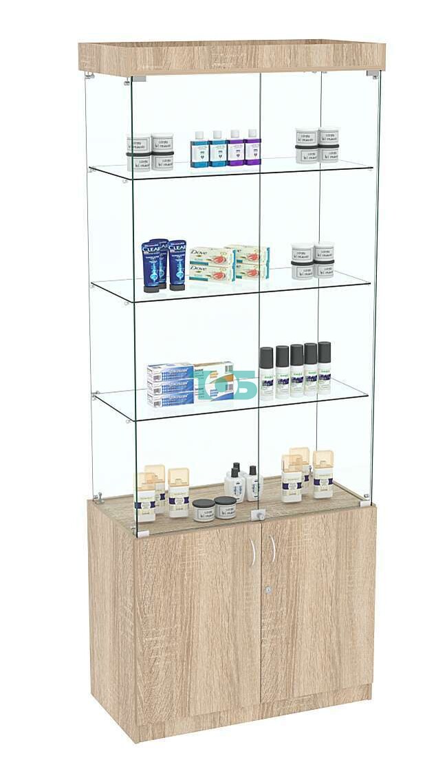 • Распашные стеклянные двери с замком: Расположены в верхней части витрины, обеспечивая удобный доступ к товарам и их безопасное хранение.