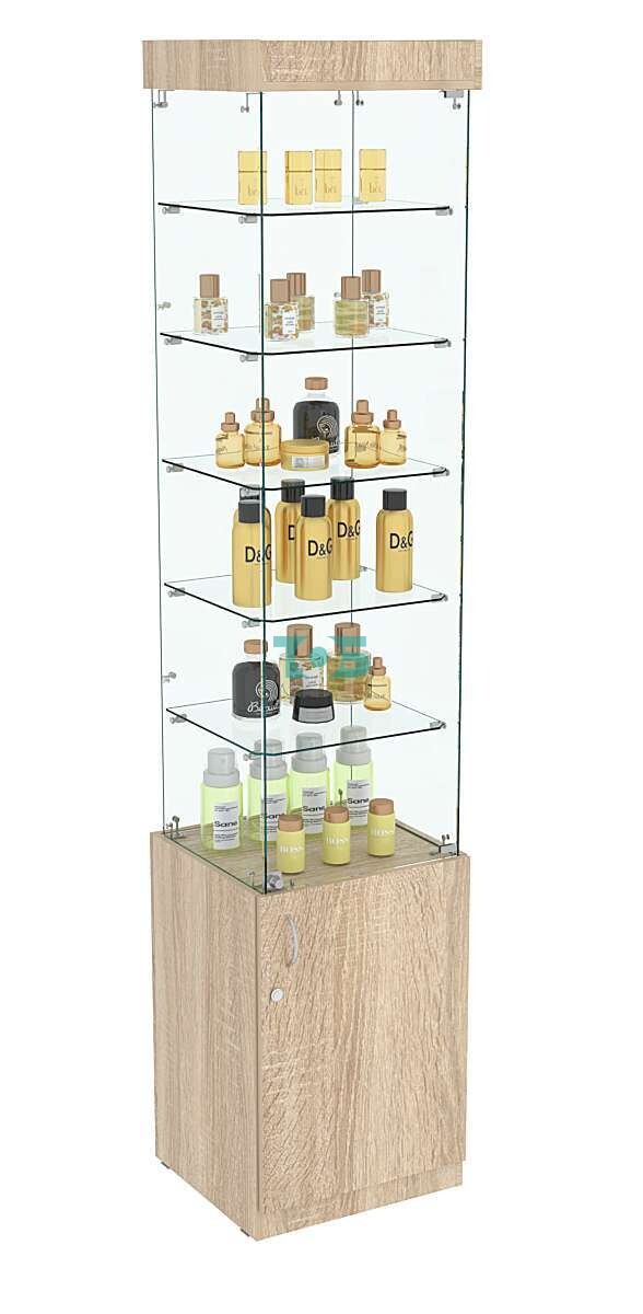 • Распашная стеклянная дверь с замком: Расположена в верхней части витрины, обеспечивает удобный доступ к товарам и их безопасное хранение.
