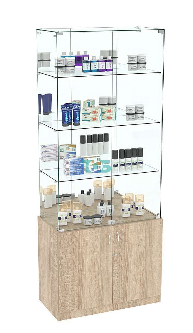 • Распашные стеклянные двери с замком: Расположены в верхней части витрины, обеспечивая удобный доступ к товарам и их безопасное хранение.
