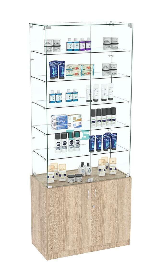 • Распашные стеклянные двери с замком: Расположены в верхней части витрины, обеспечивая удобный доступ к товарам и их безопасное хранение.