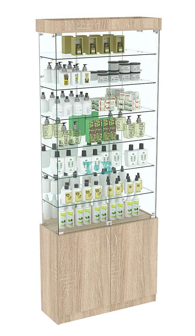 • Распашные стеклянные двери с замком: Расположены в верхней части витрины, обеспечивая удобный доступ к товарам и их безопасное хранение.