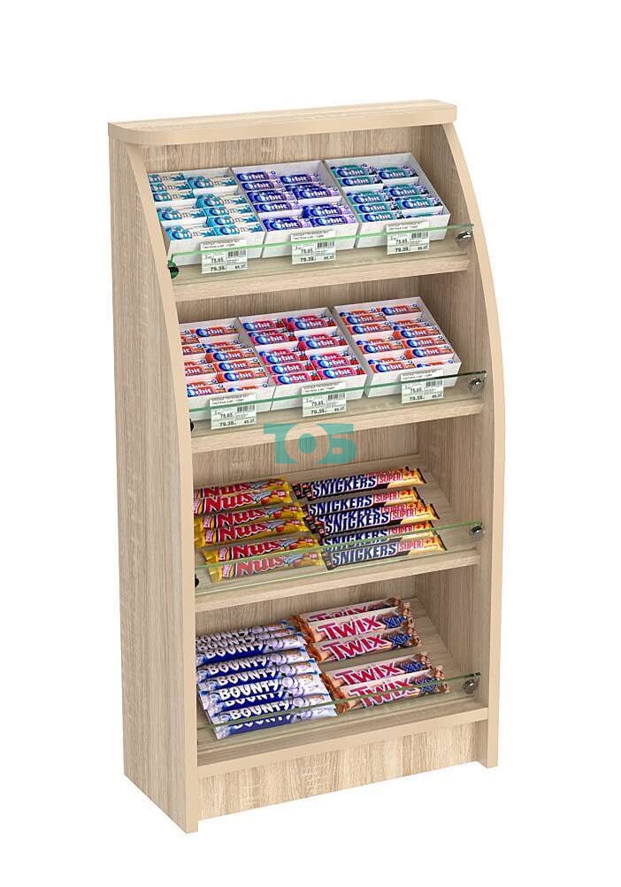 Торговый кассовый прилавок импульсных покупок с наклонными полками со стеклянными бортиками Импульс №1-3-900