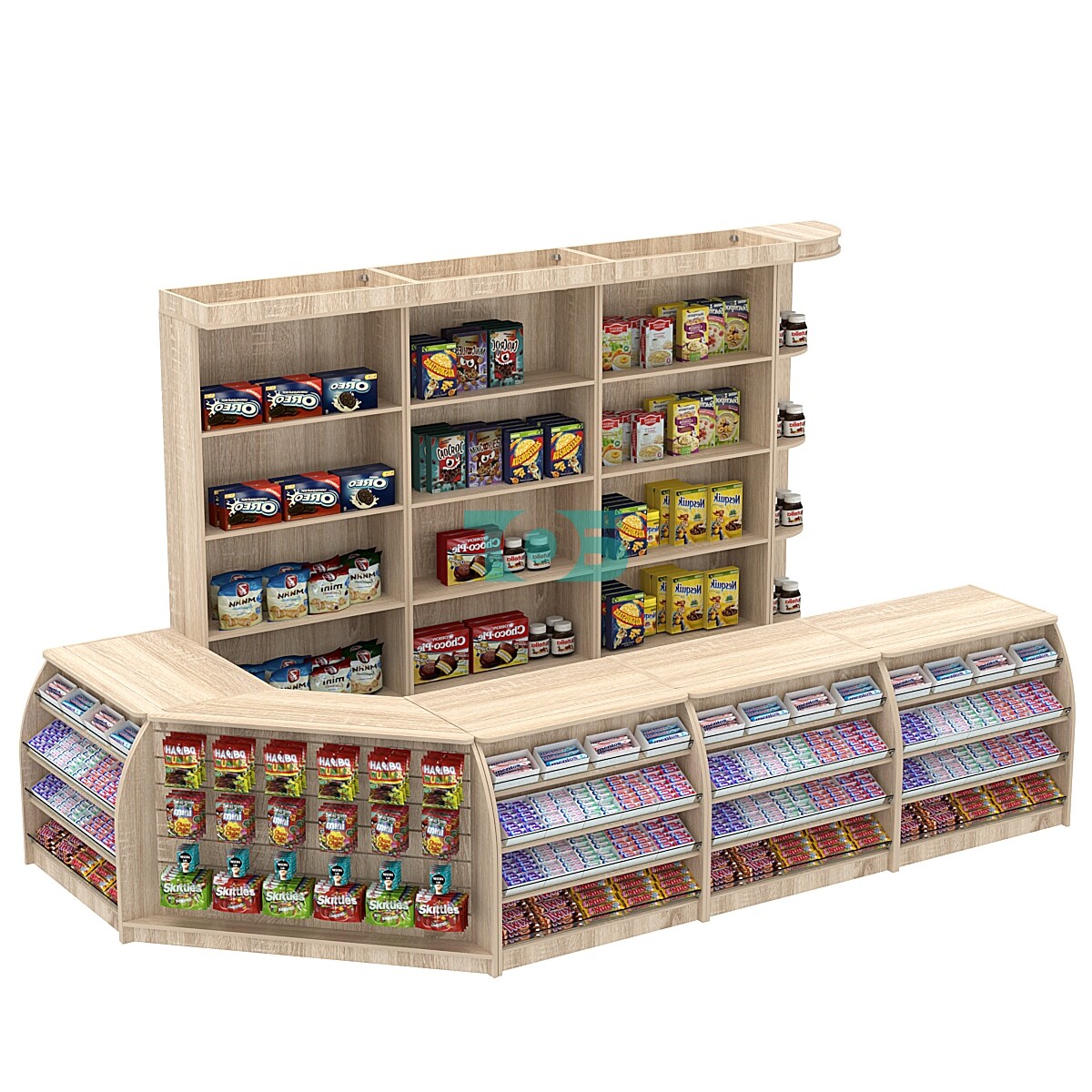 - каждый торговый модуль оборудования максимально функционален и предоставляет для продавца как закрытую зону выкладки товара, которая находится за спиной у продавца, так и зону открытого доступа для Покупателя, расположенную на фасаде прилавков, и обеспечивающую дополнительный объем продаж импульсными покупками;
