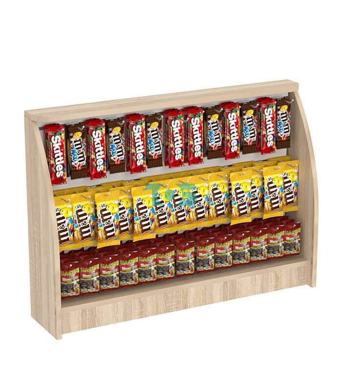 Торговый кассовый прилавок с шестью узкими наклонными полками для выкладки товаров импульсных покупок Импульс №2-3-450