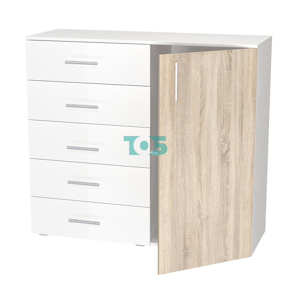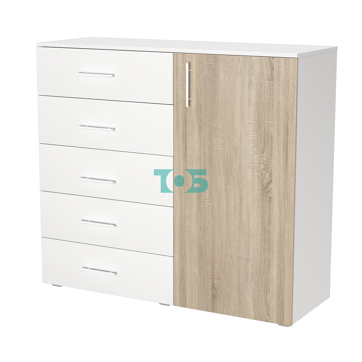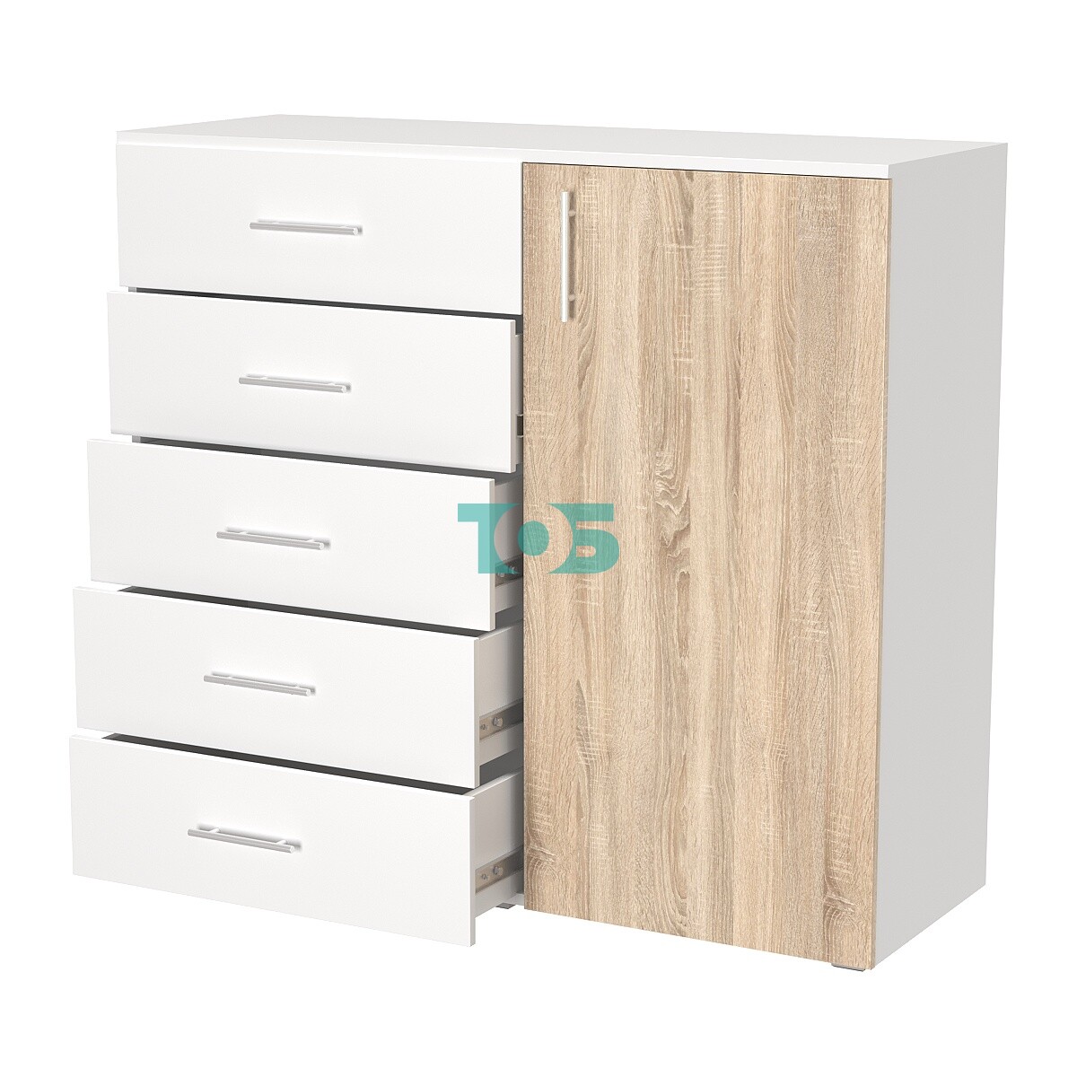 • Левая часть: 5 выдвижных ящиков – удобно для организации хранения мелких предметов, канцелярских товаров и личных аксессуаров. Ящики имеют плавный ход и легкий доступ.