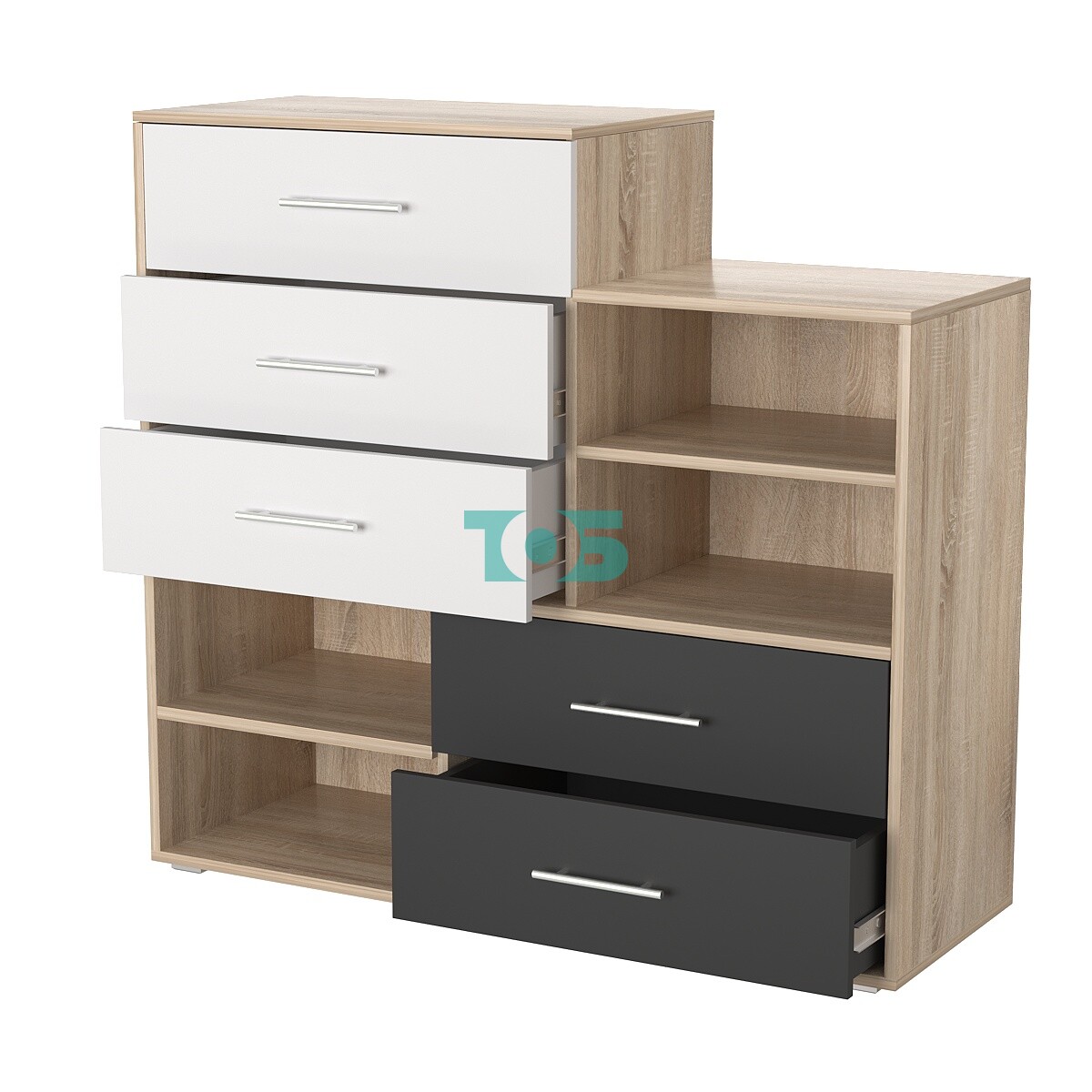 Хранение: Комод оснащен 5 выдвижными ящиками – идеально подходит для организации хранения мелких предметов, документов и канцелярии, позволяя легко находить нужные вещи.