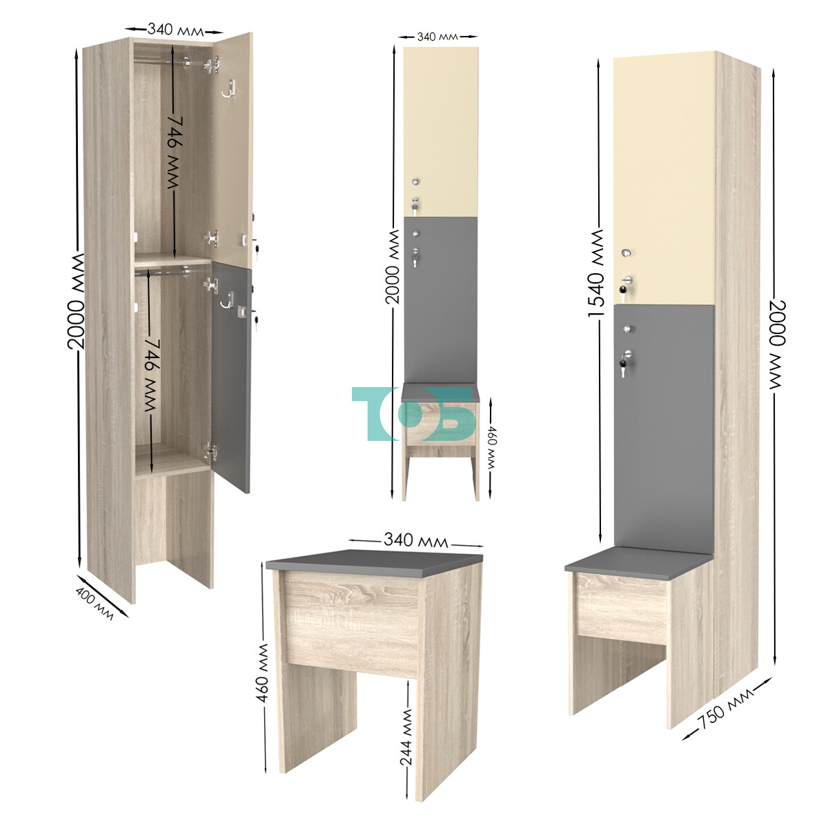 Габариты: глубина шкафа составляет 400 мм, а глубина скамейки — 350 мм. Такие размеры делают шкаф компактным и подходящим для помещений с ограниченной площадью.