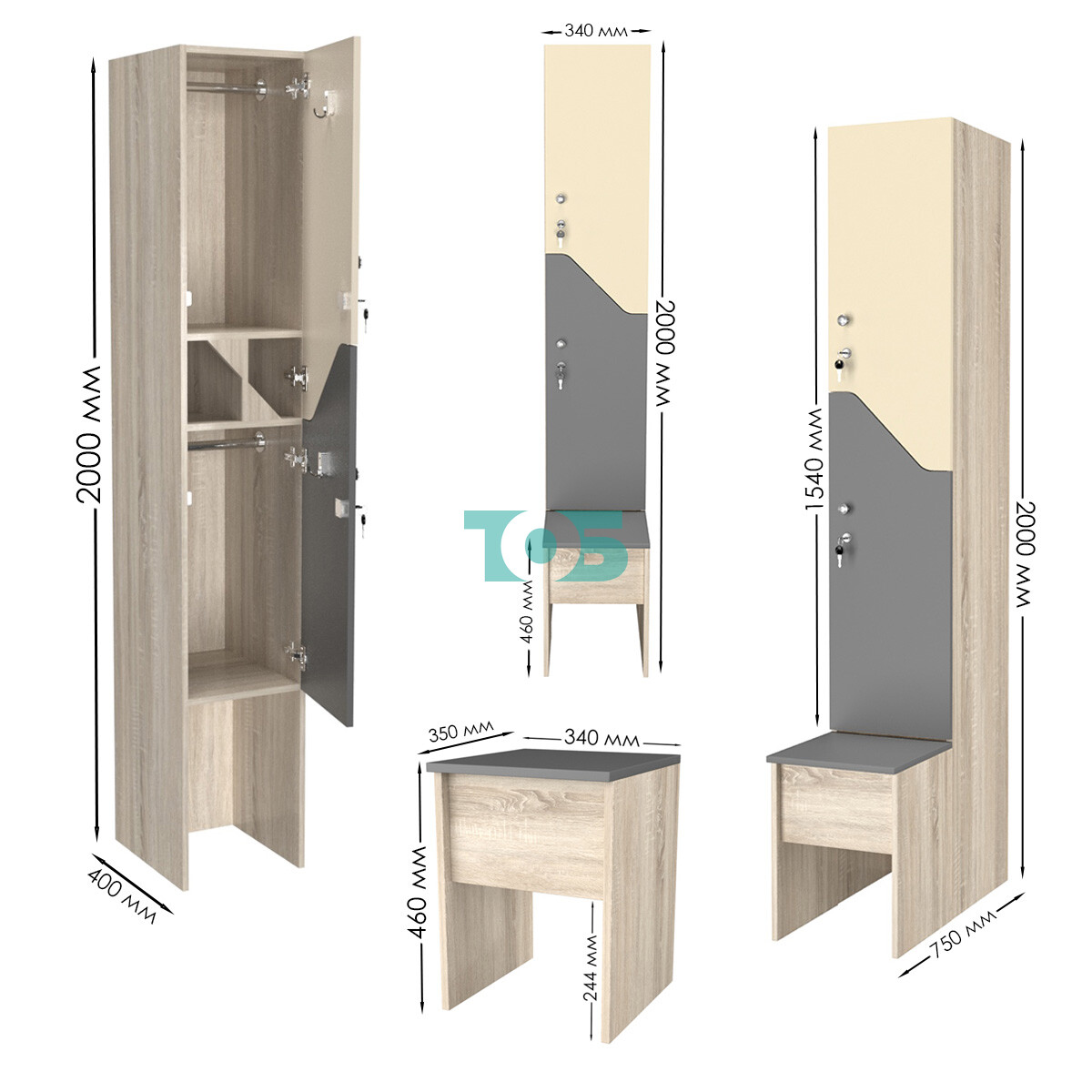 Габариты: глубина шкафа составляет 400 мм, а глубина скамейки — 350 мм. Такие размеры позволяют оптимально использовать пространство и обеспечивают удобство при использовании.