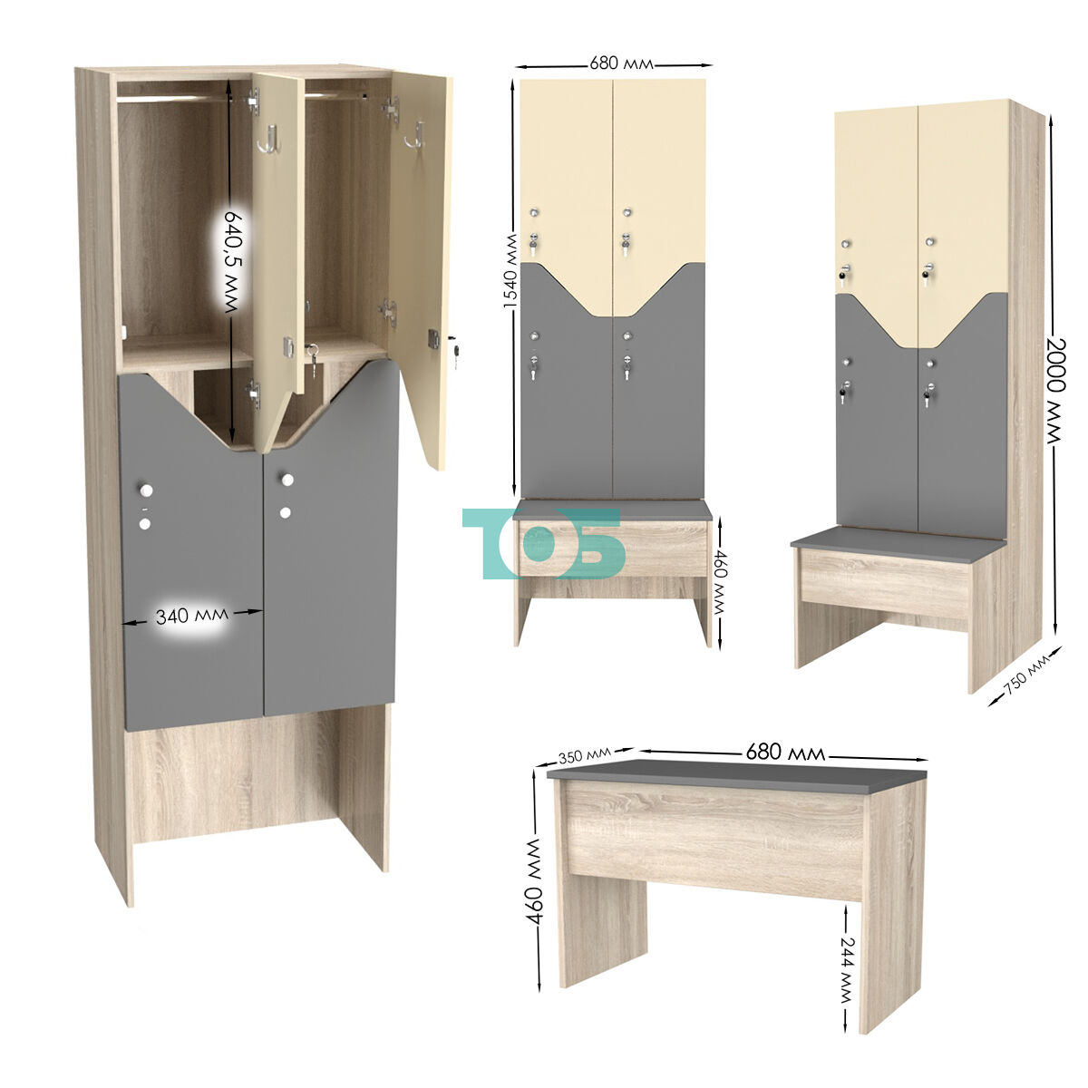 Габариты: глубина шкафа составляет 400 мм, а глубина скамейки — 350 мм. Такие размеры позволяют оптимально использовать пространство и обеспечивают удобство при использовании.