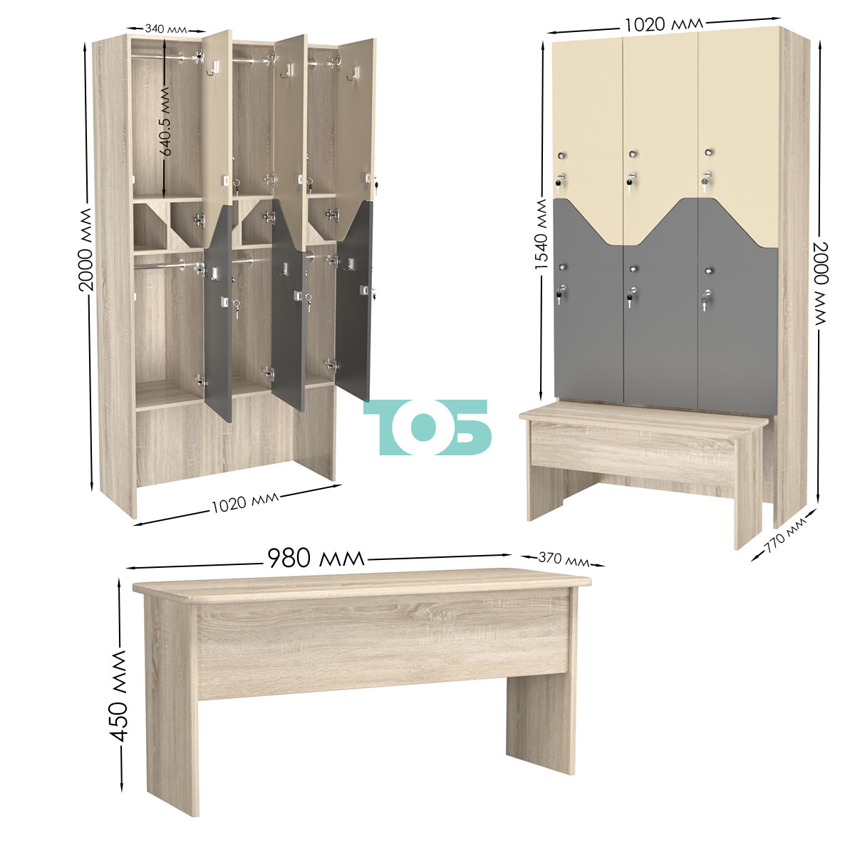 Габариты: глубина шкафа составляет 400 мм, а глубина скамейки — 370 мм. Скамейка полностью задвигается под шкаф, что позволяет экономить пространство.