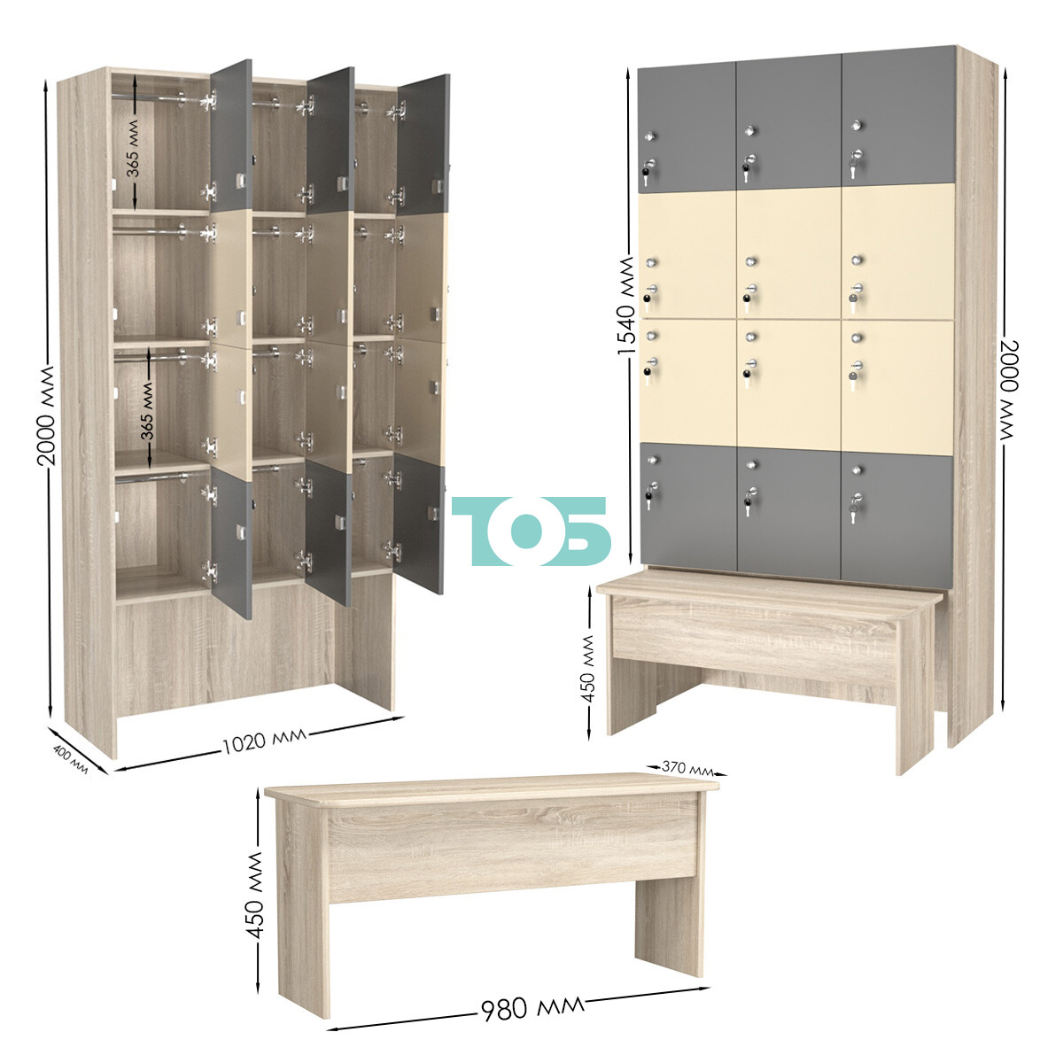 Габариты: глубина шкафа составляет 400 мм, а глубина скамейки — 370 мм. Это позволяет оптимально использовать пространство и обеспечивает удобство при использовании.