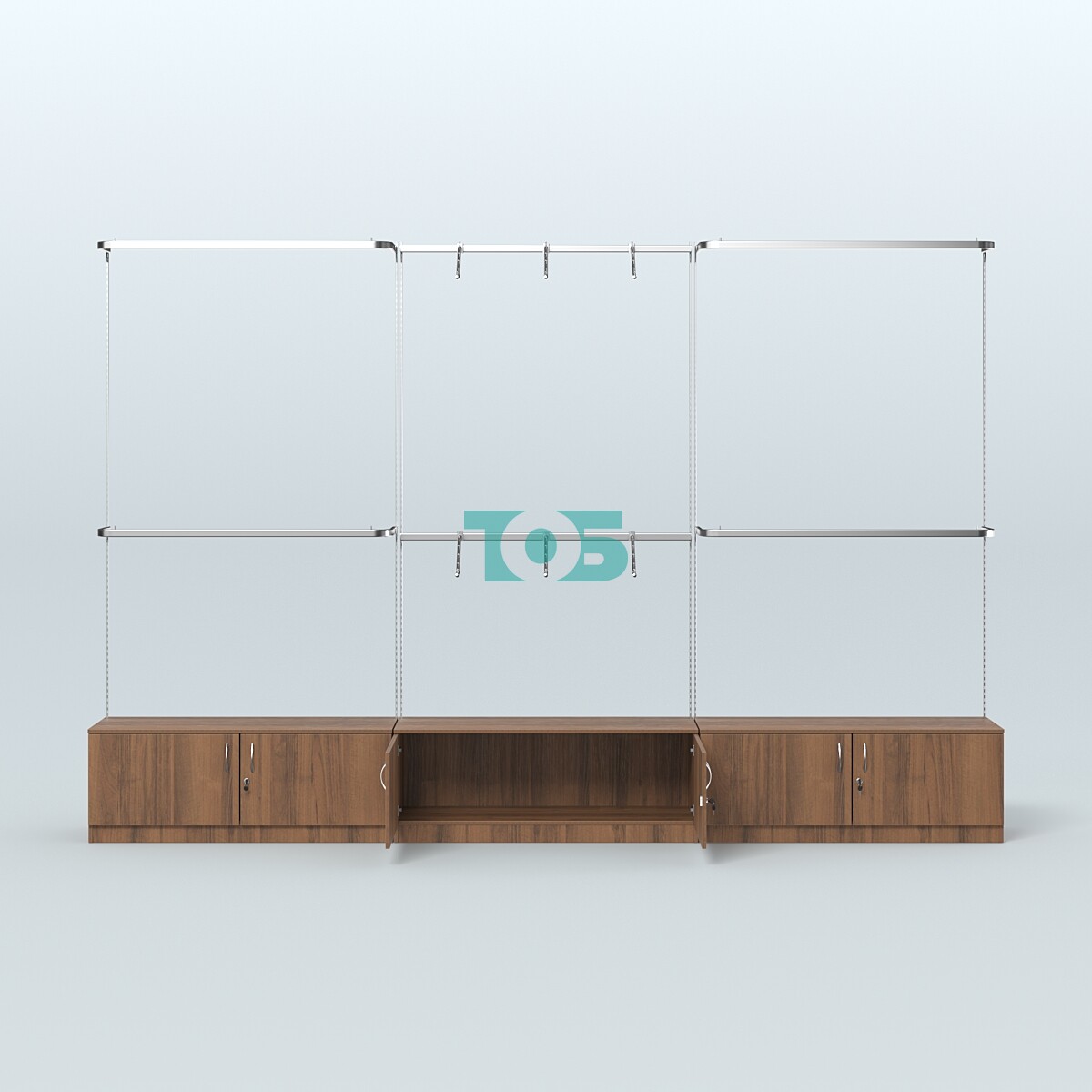 Настенная система для торговли одеждой METAL без задней стенки шириной 3000 мм с поручнями и прозрачными полками №6